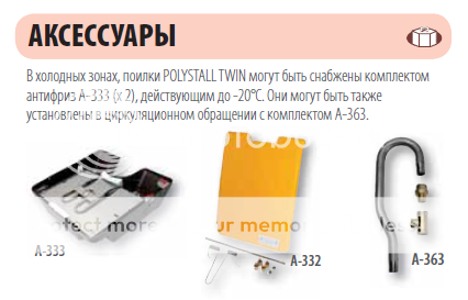 - Дополнительные опции: дверца POLYSTALL A-332 из двойного полиэтилена; нагревательный кабель C-162 (24 V, 22 W, длина 3 м) для защиты подвода воды.