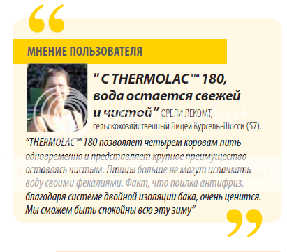 Изотермическая поилка Thermolac™ GV с 2 шариками для поения до 30 голов КРС. Антифризная поилка без использования электричества, эффективна до −30 °C. Шарики изолированы пенополиуретаном. Работает по принципу термоса: двойные стенки из высококачественного полиэтилена с изоляцией из пенополиуретана сохраняют температуру воды. Поставляется ООО "Милкос".